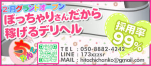 | メッセージ | 「風俗のお仕事に興味があるけど、 私太っているから・・・」 「どうせ、ぽっちゃりは稼げないんでしょ?」 そんな貴方はぜひ、茨城日立ちゃんこにお越し下さい! 当店は全国100店舗以上展開する 日本最大手ぽちゃデリグループ店です! お客様はぽっちゃり大好きな人ばかりで、 安心・安全・安定して働ける! つまり、ぽっちゃり《だから》稼げる店なんです! 私達と一緒に、胸を張って笑顔で稼いじゃいましょう! 貴方のそのコンプレックスは自信に変わります! |